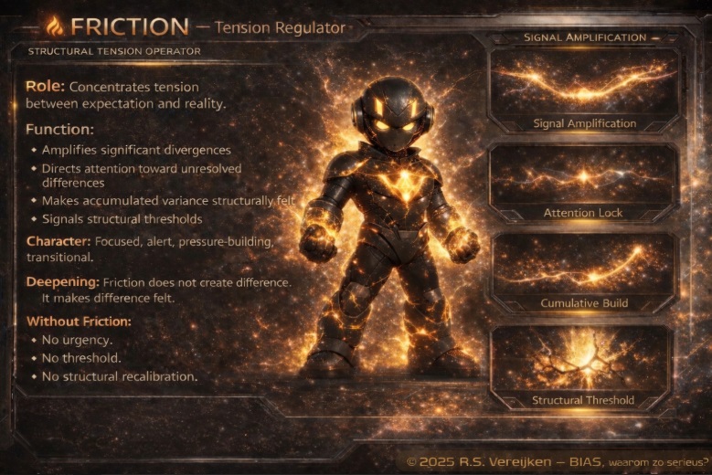 Frictie combineert meerdere Ruis-signalen tot coherent Δ-moment; katalysator van aandacht en verandering.