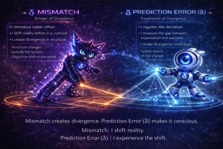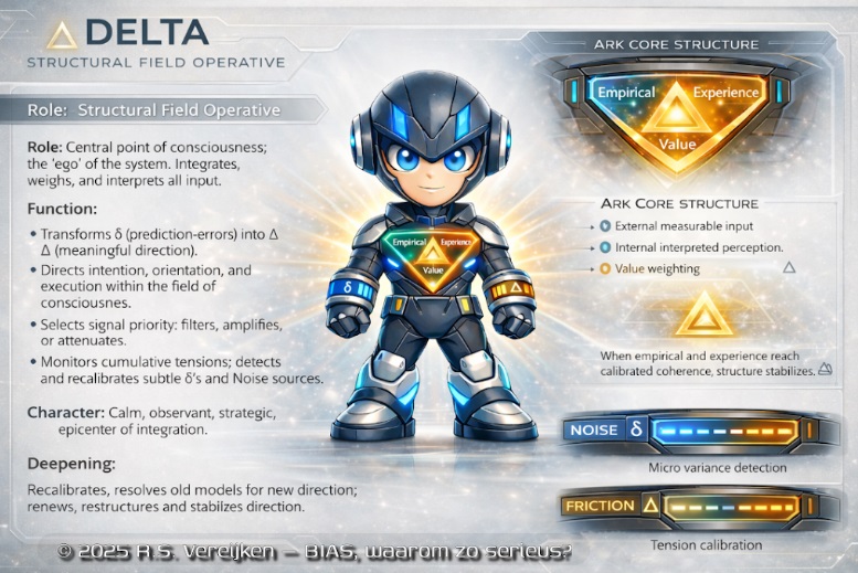 Delta is actief, adaptief en anticiperend. Zonder Delta blijven δ's ruwe signalen, Ruis chaotisch en Mismatch speels zonder richting. Δ-momenten ontstaan alleen door integratie van meerdere inputs en cumulatieve δ's.