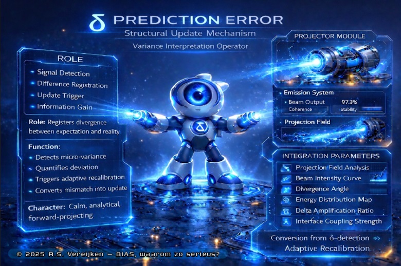 δ (prediction-error) is geen fout; het is passieve informatie. Meerdere δ's vormen de voedingsbodem voor betekenisvolle Δ-momenten en maken interpretatie en prioritering mogelijk.