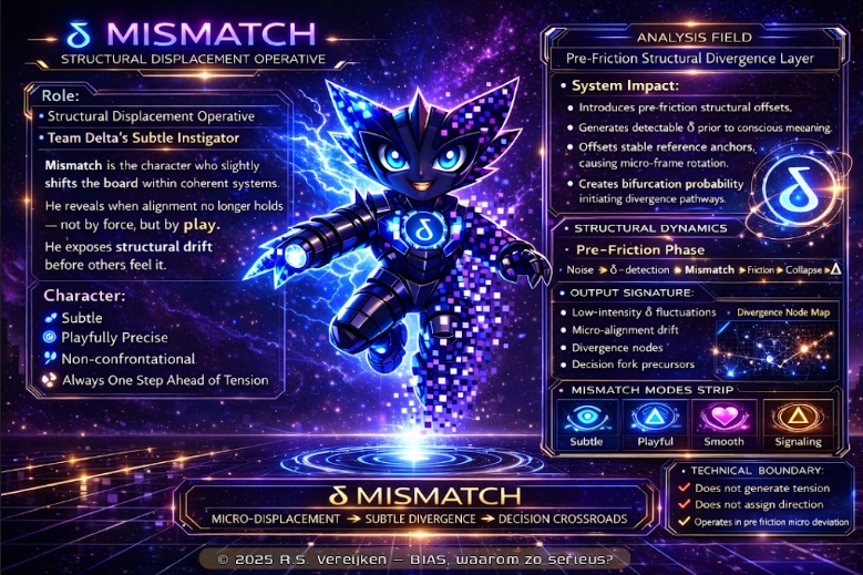 Het Delta Universe-concept, inclusief alle karakters (Delta, Ruis, Frictie, Mismatch, Collapse, Rebuilt, δ en Δ), mechanismen, interacties, narratieve structuren, integratieprocessen en alle afgeleide of toekomstige cognitieve, systemische of visuele structuren, is beschermd intellectueel eigendom.